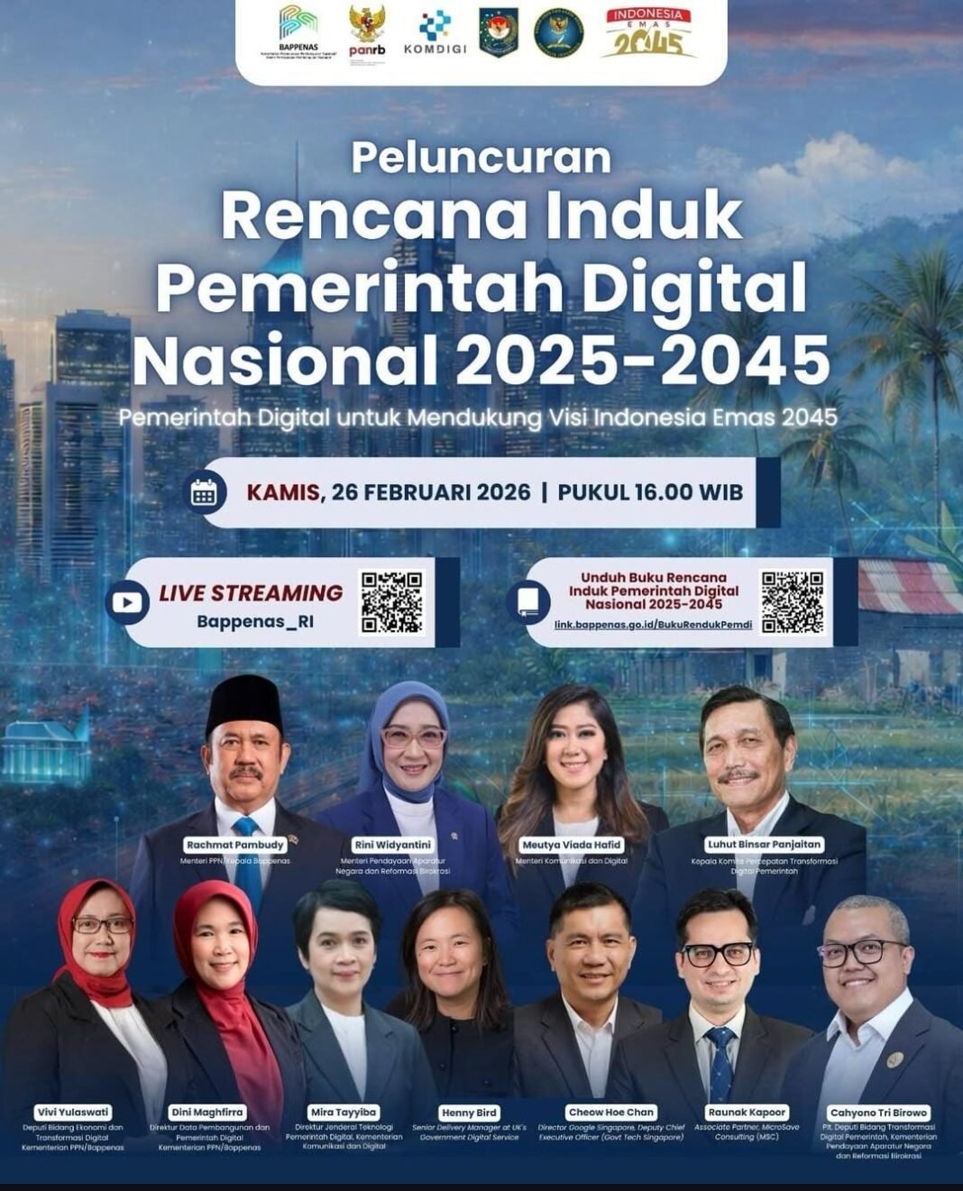 Peluncuran yang berlangsung pada Kamis, 26 Februari 2026 pukul 16.00 WIB ini dihadiri oleh jajaran menteri kunci, termasuk Rachmat Pambudy (Menteri PPN/Kepala Bappenas), Rini Widyantini (Menteri PANRB), Meutya Viada Hafid (Menteri Komdigi), serta Luhut Binsar Panjaitan selaku Kepala Komite Percepatan Transformasi Digital Pemerintah.