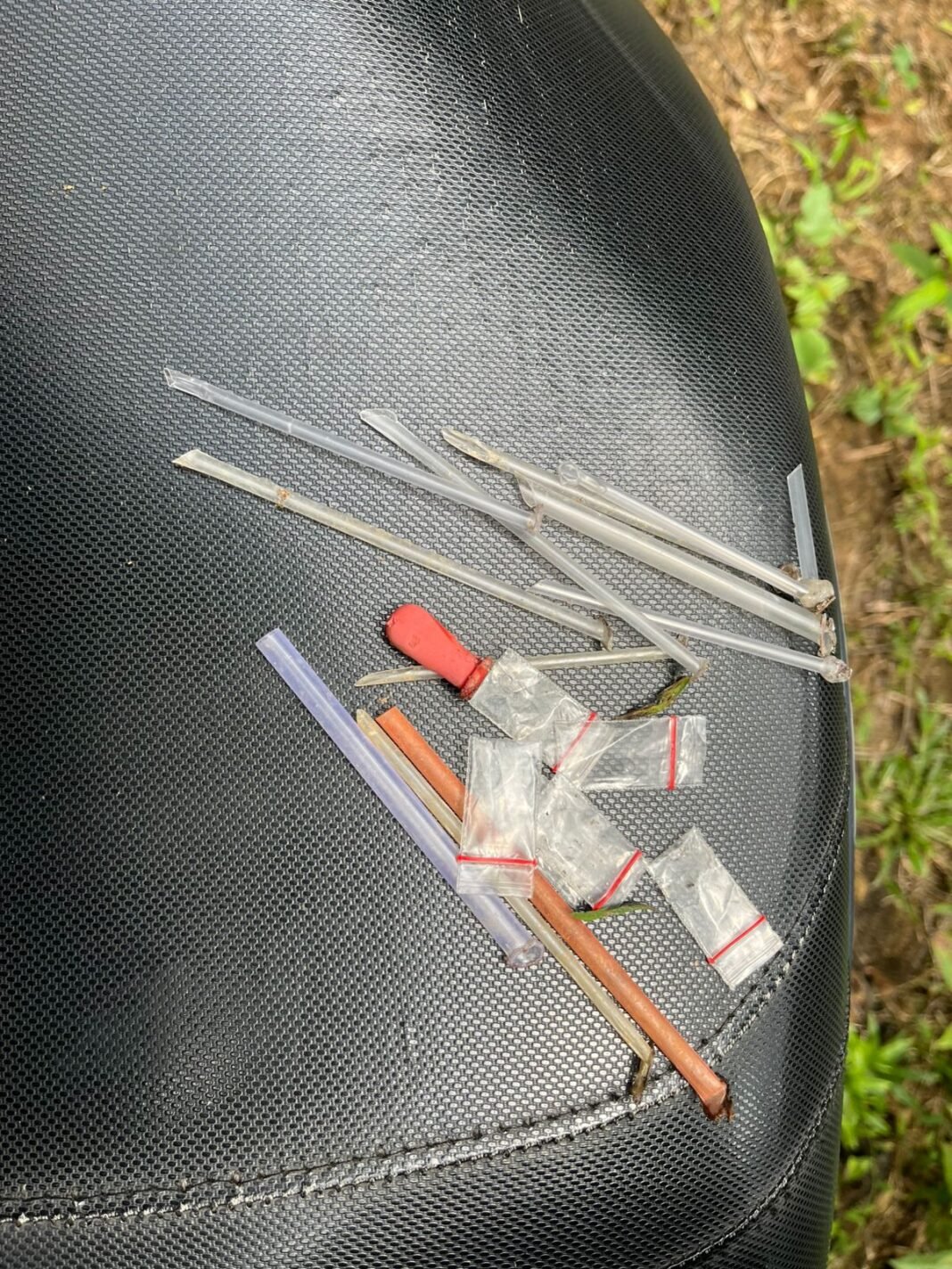 Ketika dilakukan penyisiran di lokasi sekitaran barak tersebut, ditemukan barang bukti berupa : 5 (lima) buah plastik klip kosong, 10 (sepuluh) buah pipet serta 1 (satu) buah alat hisap sabu (bong).
